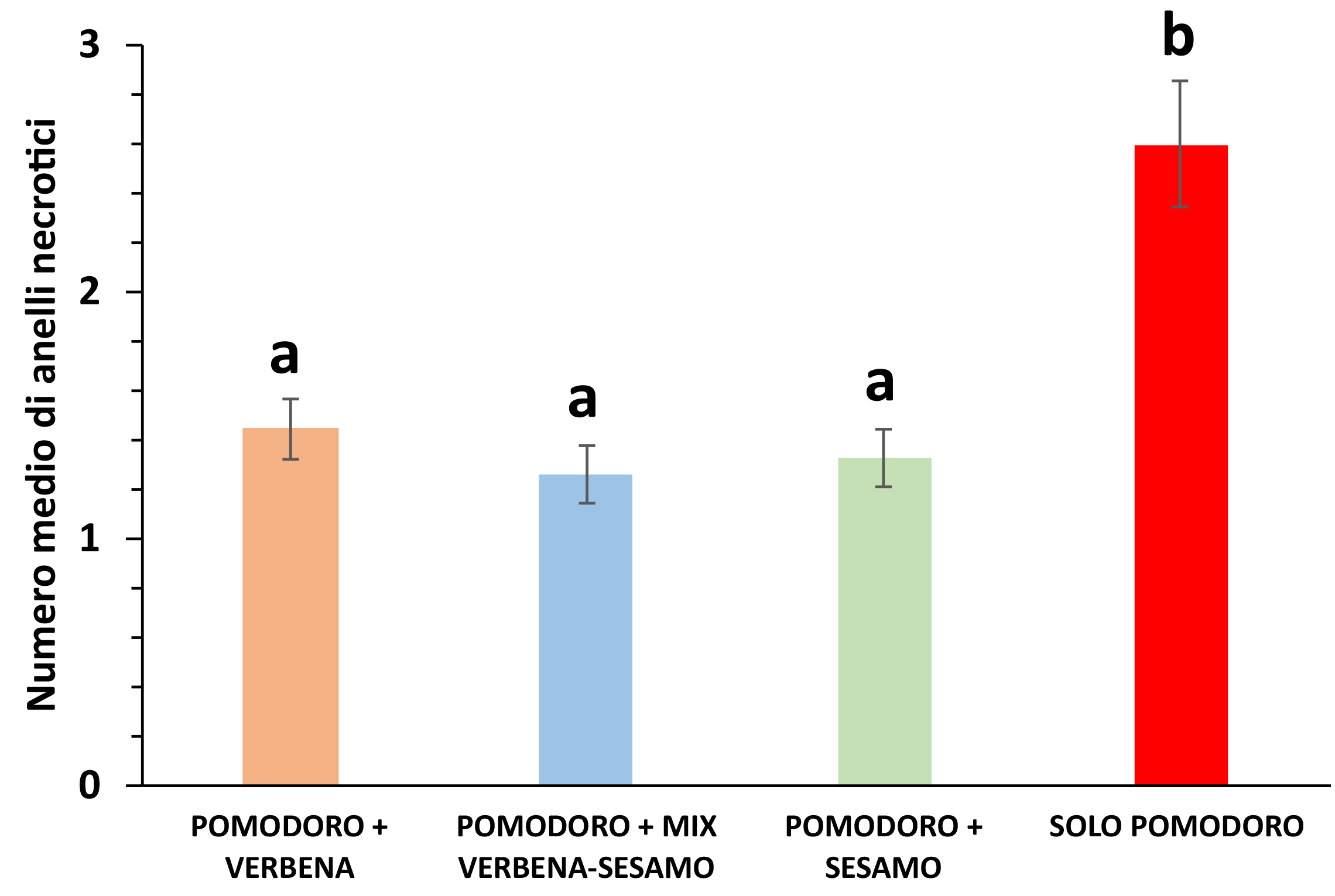 Al termine del primo anno di attività, l’analisi dei dati acquisiti ha evidenziato la tendenza alla riduzione della comparsa degli anelli necrotici sulle piante di pomodoro poste nelle parcelle in cui erano presenti anche le piante alternative (figura 1) indipendentemente dalla loro distanza da quest’ultime. Il numero medio di esemplari di N. tenuis osservati sulle piante di pomodoro ha registrato la stessa tendenza tra le tesi. Inoltre, il numero medio di mine di T. absoluta mostrava una bassa variabilità tra i trattamenti, anche se è risultato tendenzialmente più alto nella tesi in cui erano presenti solo piante di pomodoro.