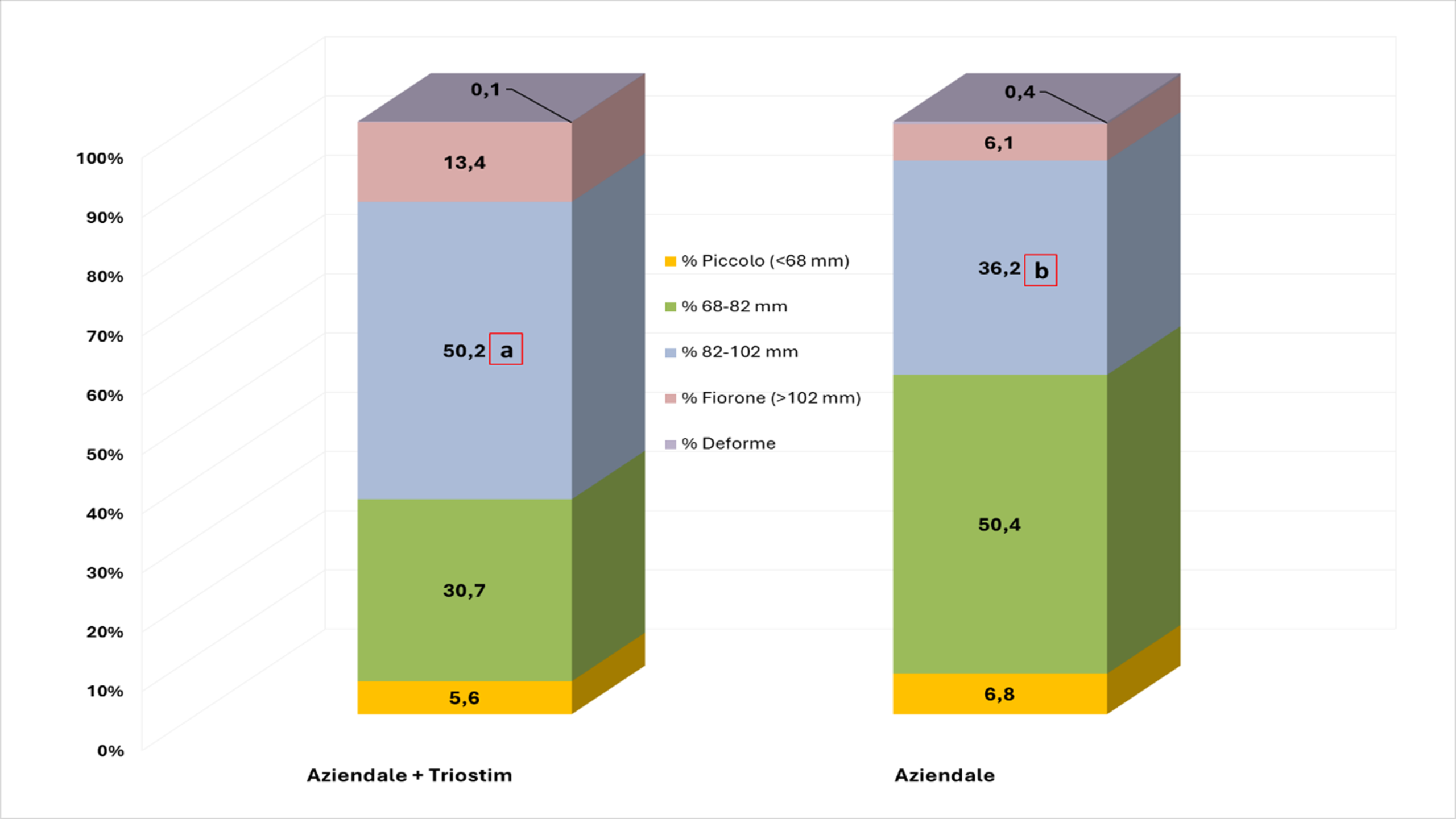 L’effetto del Triostim si è manifestato anche nella redistribuzione della produzione verso la classe di calibro più elevata (fig. 1), con un incremento significativo sia della frazione di calibro 82–102 mm che nel peso medio ponderato della frazione commerciale. A livello di frazioni di scarto è stata osservata una riduzione della frazione di sottocalibro (5,6% vs 6,8%) e una maggiore presenza di frutti superiori ai 102 mm (13% vs 6%) con una percentuale di scarto del 19% nel trattato e del 13% nel testimone. Da segnalare riguardo alle frazioni di scarto che la metodologia è stringente sui rispettivi diametri e non tiene in considerazione quanto i produttori potrebbero comunque commercializzare in funzione dei mercati di riferimento.