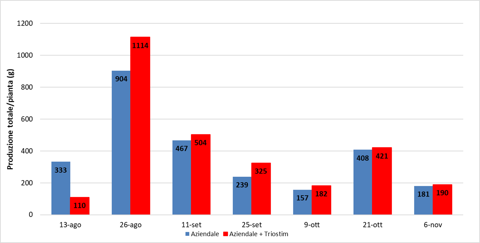 Le raccolte, effettuate dal 13 agosto al 6 novembre per un totale di sette stacchi, hanno evidenziato una produzione totale leggermente superiore nella tesi trattata con Triostim (2,85 kg/pianta) rispetto al testimone (2,69 kg/pianta), con un incremento del 6%, non significativo all’analisi statistica pari a 4,3 q/1000 m2. Analogo andamento è stato osservato per la produzione commerciale, pari a 2,29 kg/pianta nella tesi Triostim e 2,16 kg/pianta nel testimone ed un delta sui 1000 m2 di 3,5 q a favore del trattato.